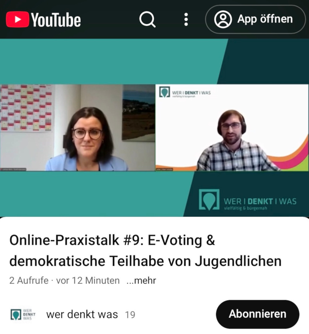 Die Stadt Konstanz ermöglicht Jugendlichen zwischen 14 und 19 Jahren seit 2022 die Wahl ihrer Jugendvertretung. Seit 2023 setzt die Stadt dabei auf eine digitale Wahl mit einem rechtssicheren e-Voting-Tool der wer denkt was GmbH. Im Praxistalk berichtet Wahlleiterin Larissa Weis über die Einführung und Durchführung der Jugendwahl in Konstanz sowie über die Hintergründe für den Umstieg auf das digitale Format. Dabei gibt sie Einblick in die Abläufe, geht auf Erfolgsfaktoren für hohe Beteiligungsquoten ein und teilt ihre Learnings aus drei Jahren erfolgreicher Online-Wahl.